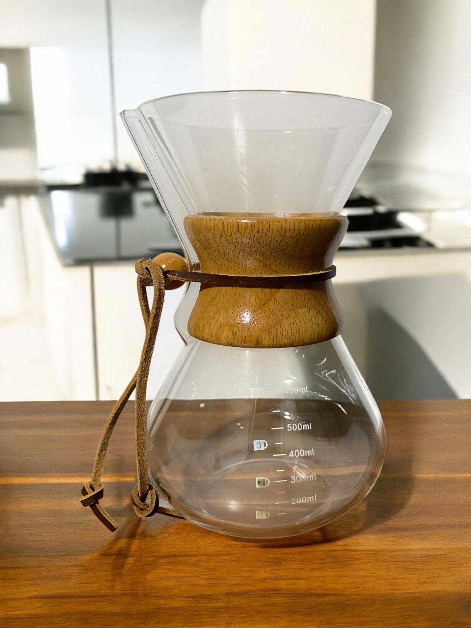 La Cafetera de Vidirio (Tipo Chemex) combina diseño sofisticado y funcionalidad excepcional. Perfecta para los verdaderos entusiastas del café, garantiza una extracción impecable y un sabor inigualable. Diseñada para realzar cada taza de café y elevar tu experiencia de degustación a otro nivel.